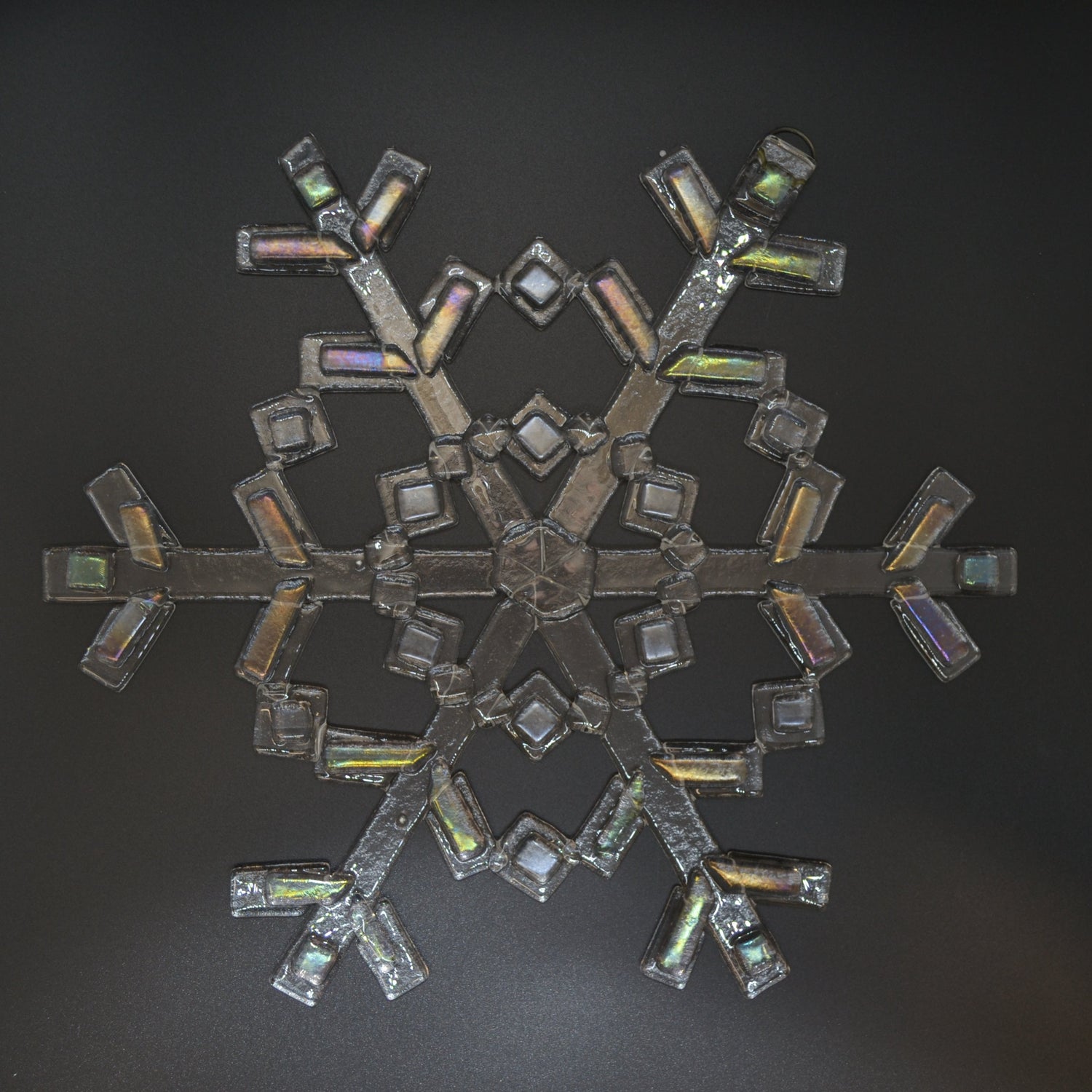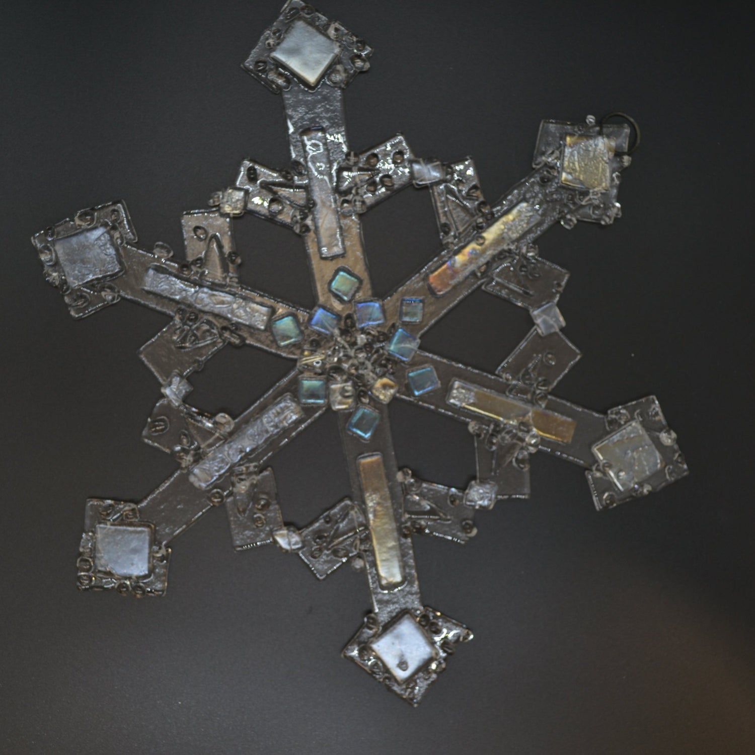 Beautiful ice-like glass snowflakes suspended on organza ribbons. Created by fusing individually hand-cut pieces of glass together. Light enough to hang on the tree or a bough (small size only), large enough to make a spectacular display in your window or across a fireplace.