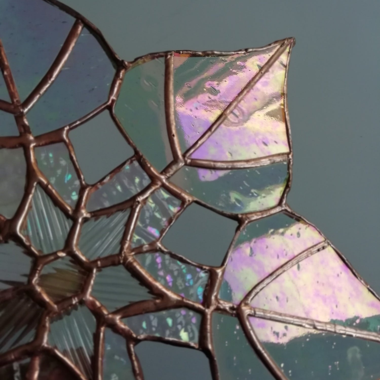 Constructed from gorgeously patterned iridescent textured glasses, this beautiful glimmering 12" snowflake contains 43 Individually hand cut pieces which are soldered together and finished with gleaming copper patina.