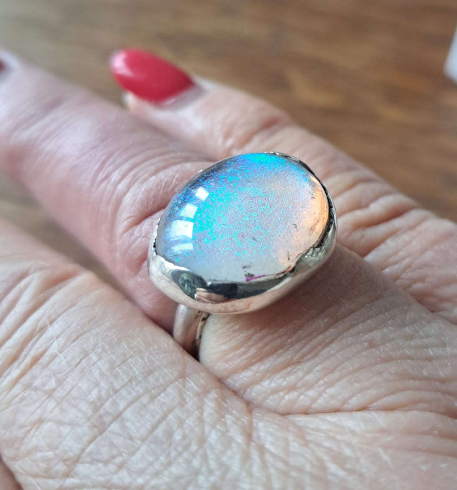 An exquisite chunky silver cocktail ring set with a round sparkly white dichroic fused glass cabochon.
