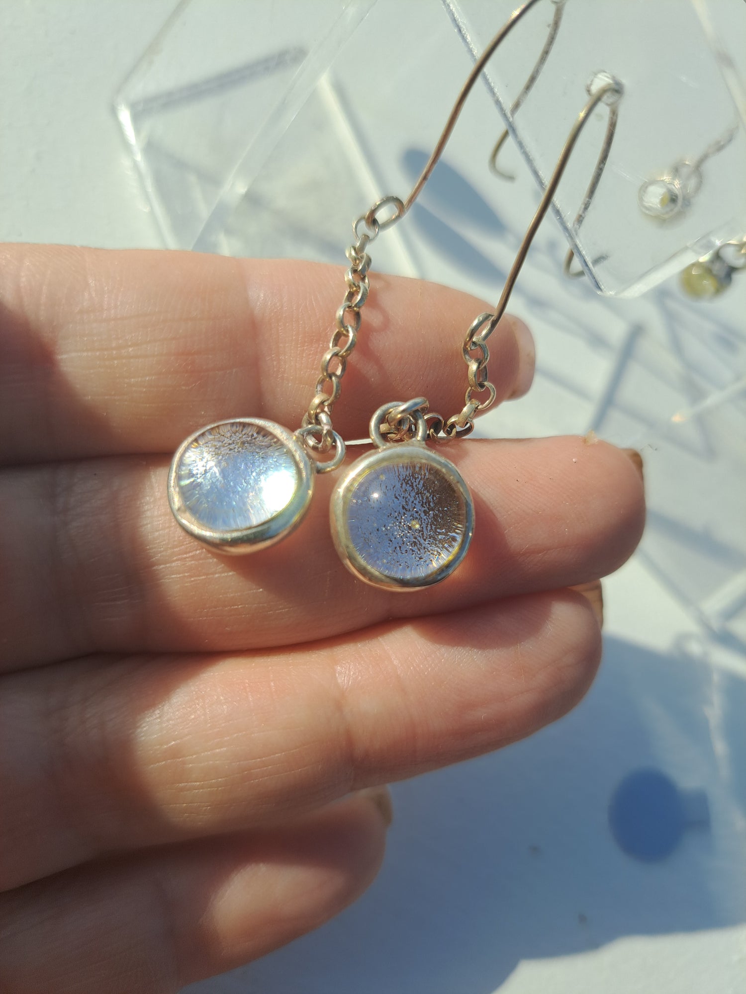 Pretty sparkly glass cabochon encased in PMC fine silver, suspended on a delicate silver chain from handmade sterling silver wire earring hooks.