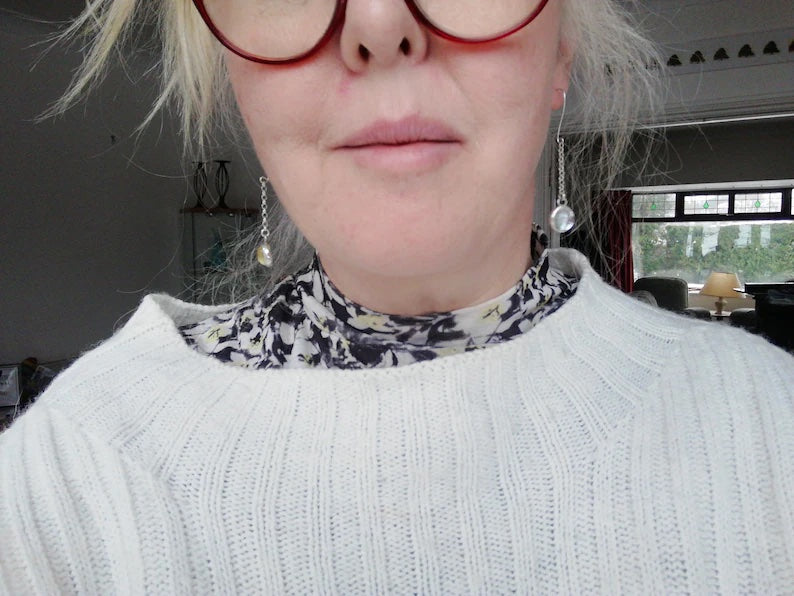 After cleaning and polishing these are then suspended by silver chains from hand formed silver wire earrings hooks.