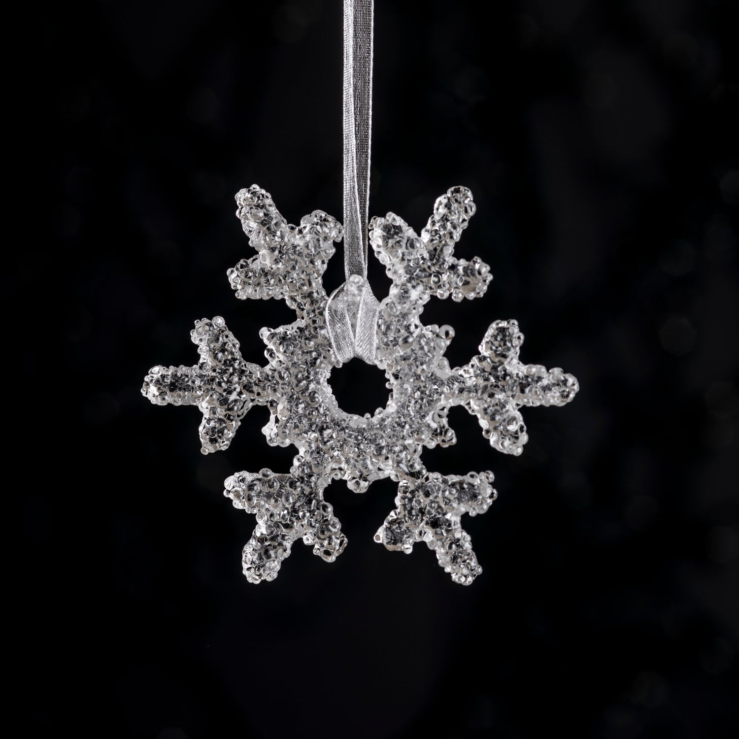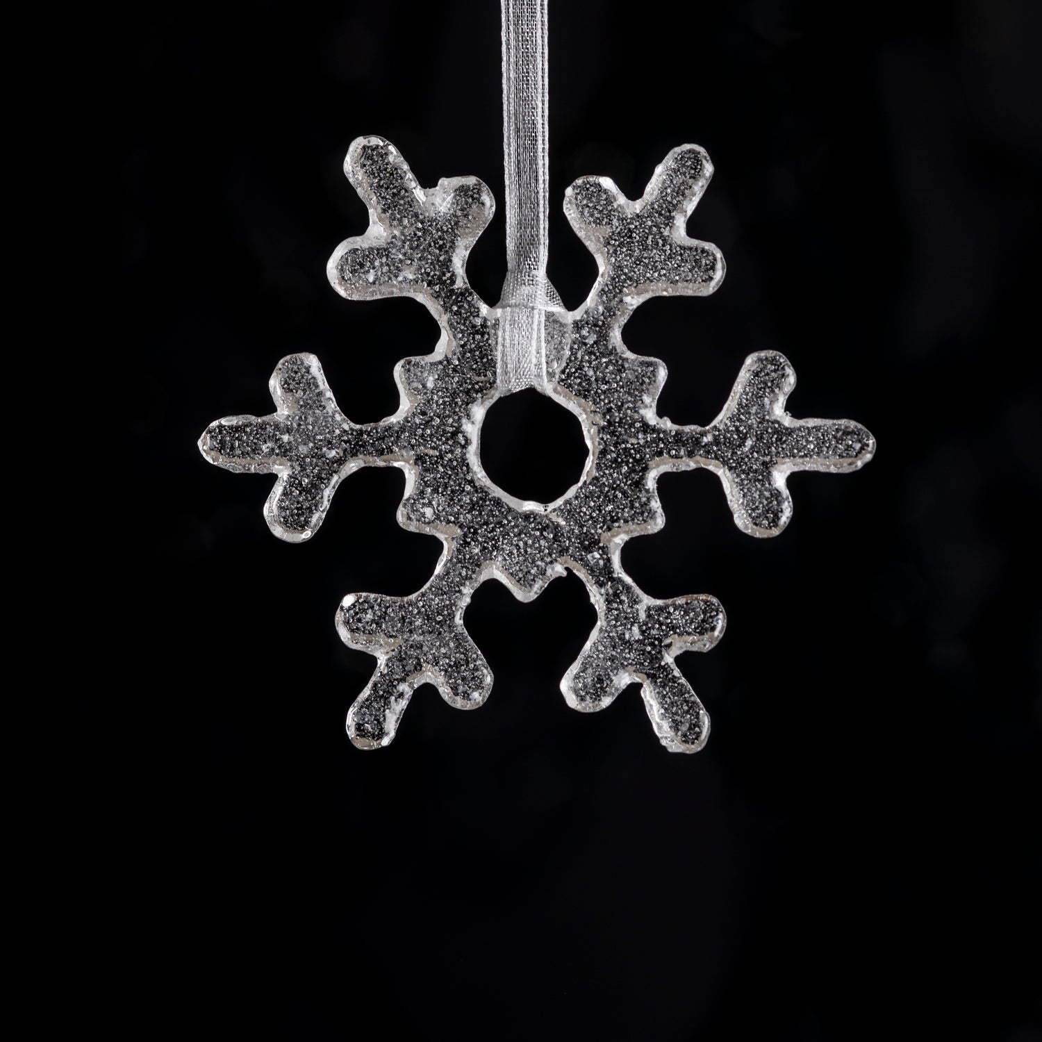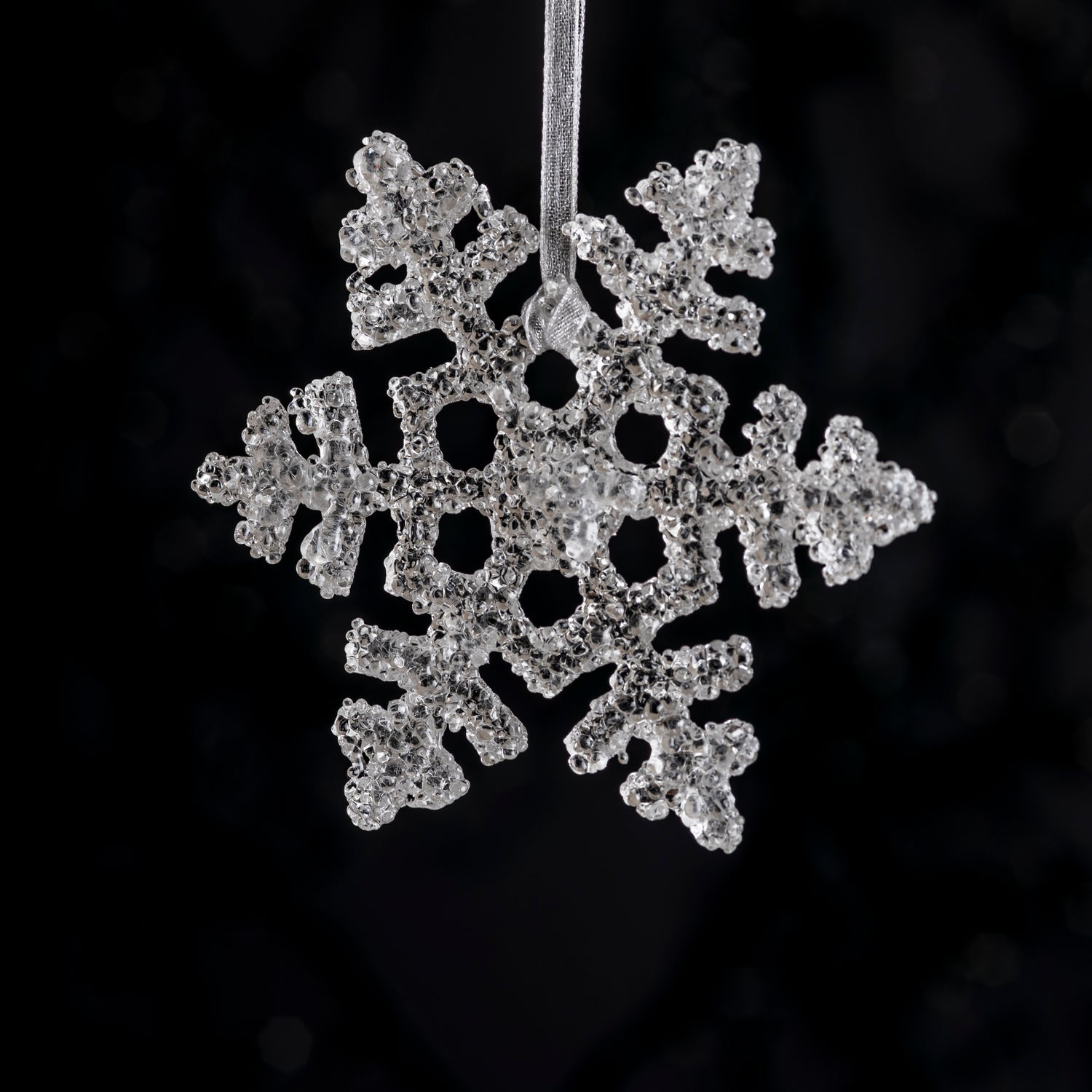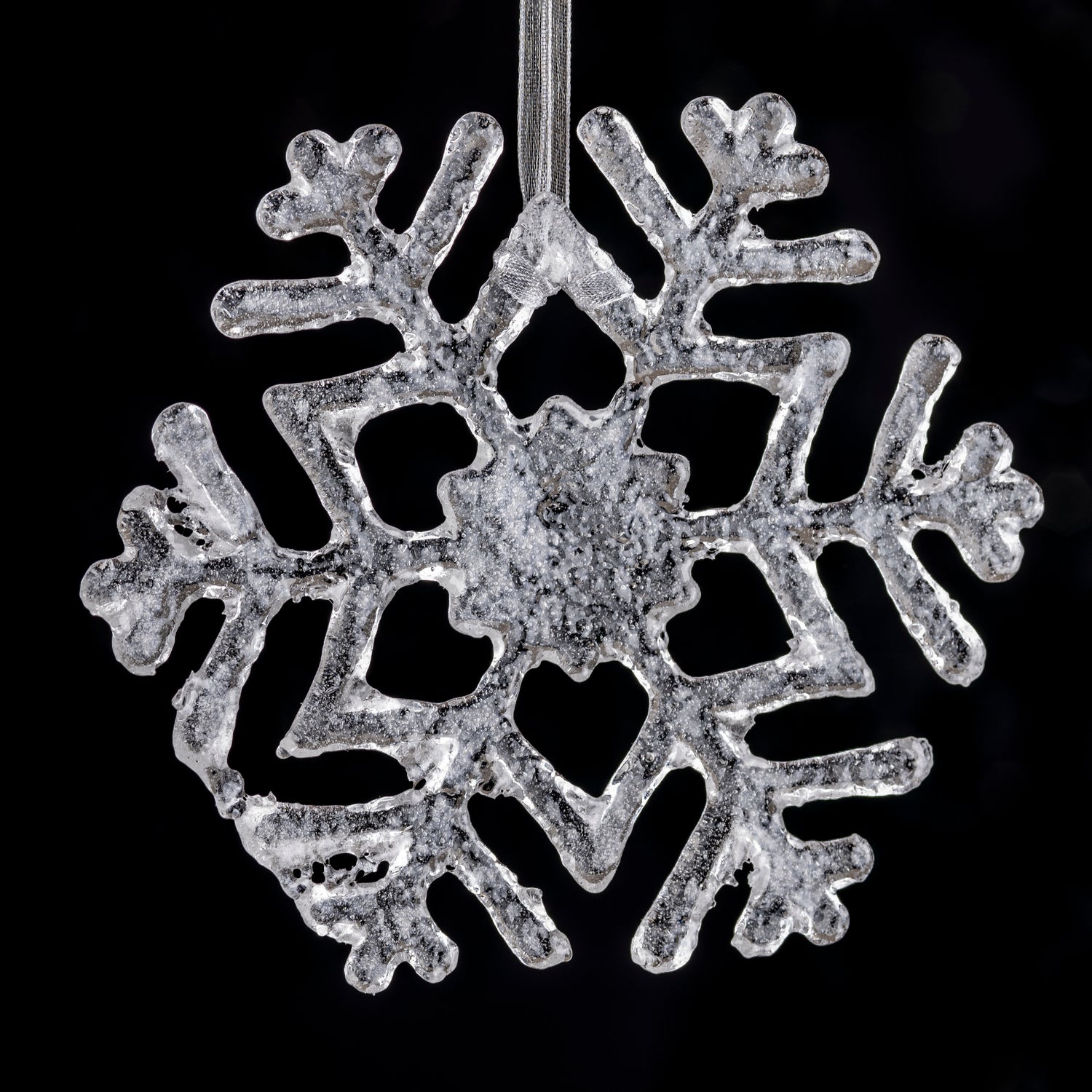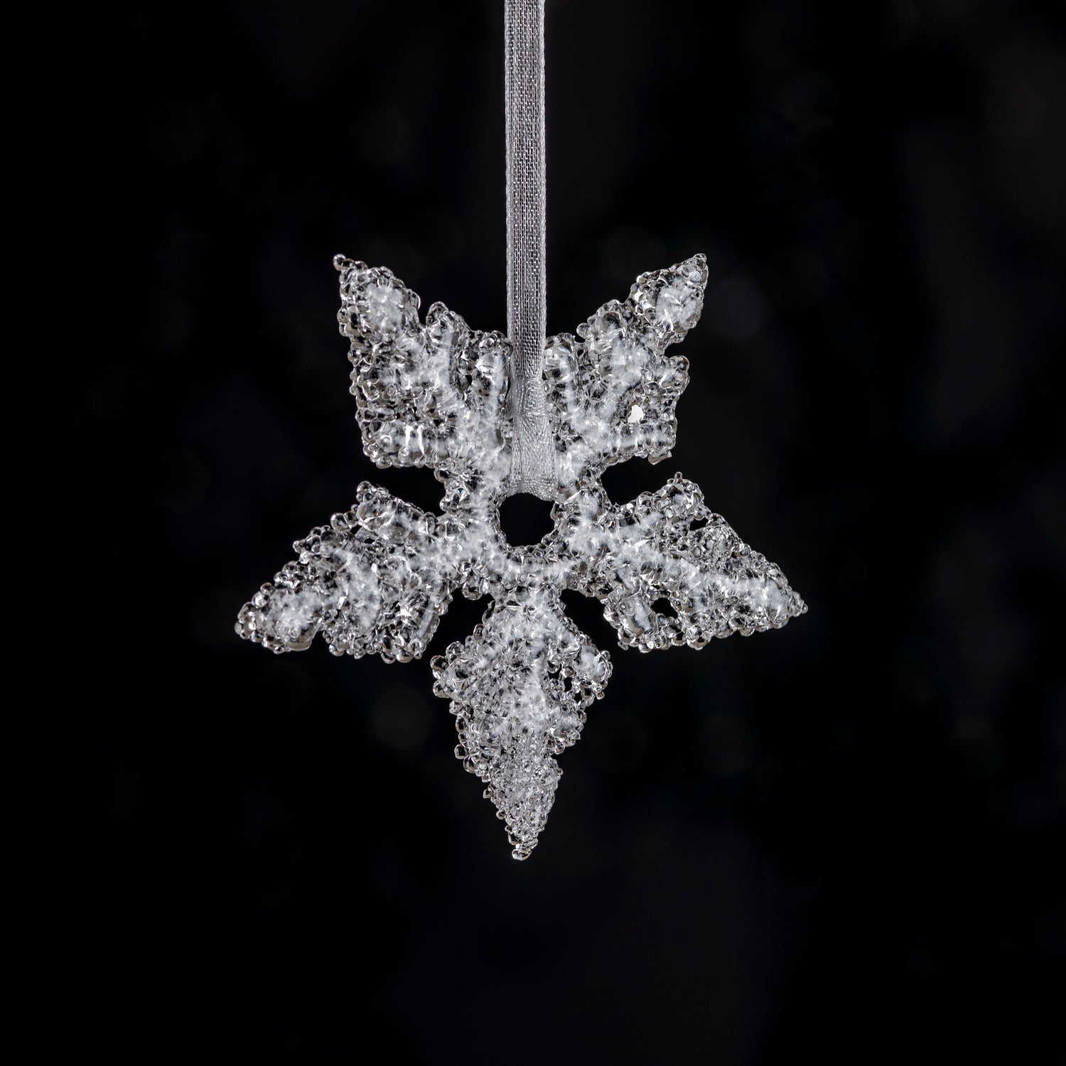 Beautiful ice-like glass snowflakes suspended on organza ribbons. Light enough to hang on the tree, large enough to make a display in your window or across a fireplace.