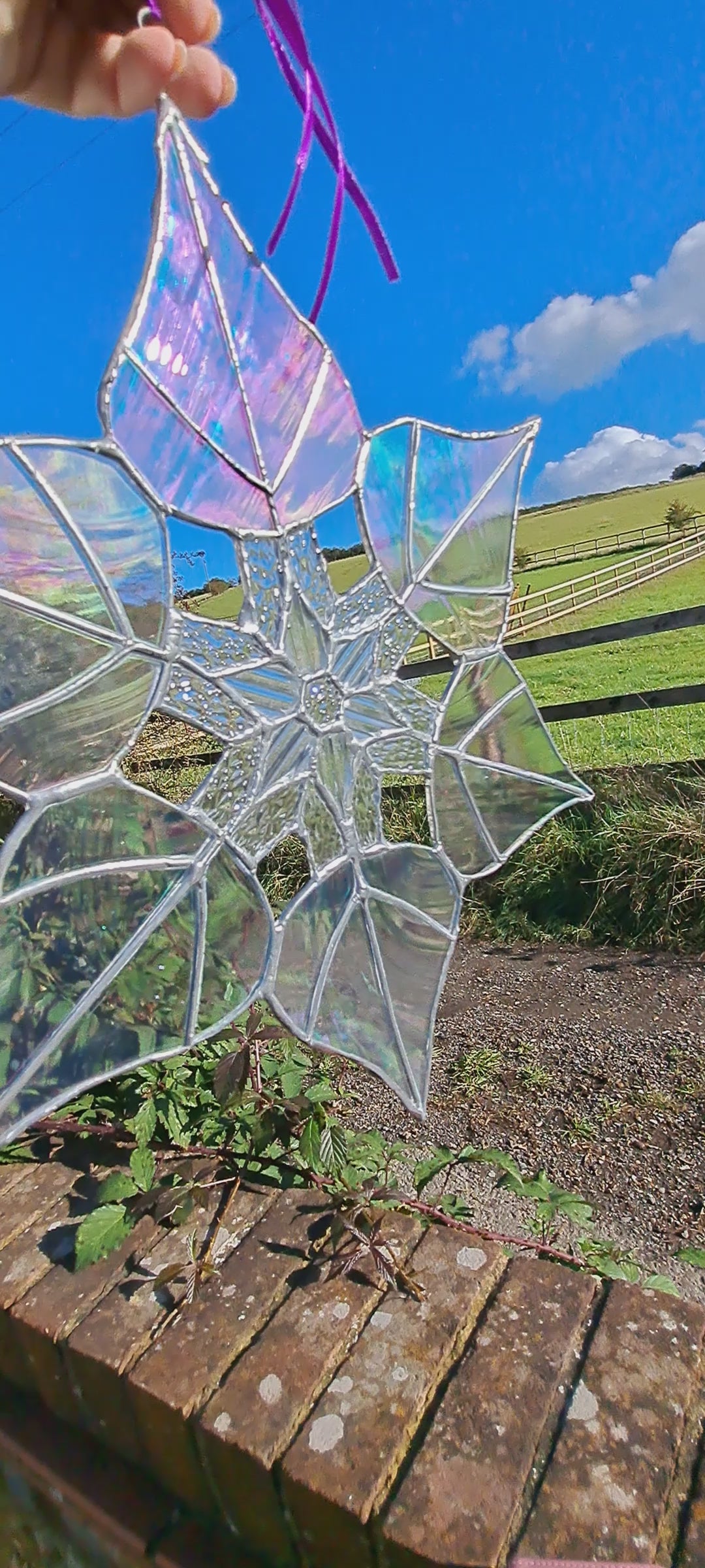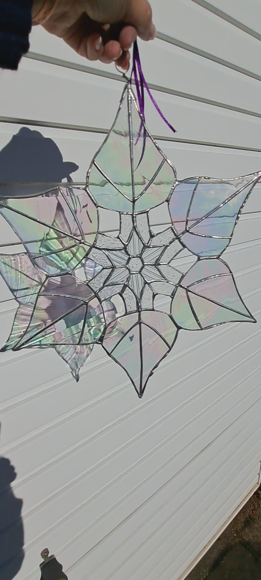 Constructed from gorgeously patterned iridescent textured glasses, this beautiful glimmering 12" snowflake contains 43 Individually hand cut pieces which are soldered together and finished with gleaming polished silver solder.