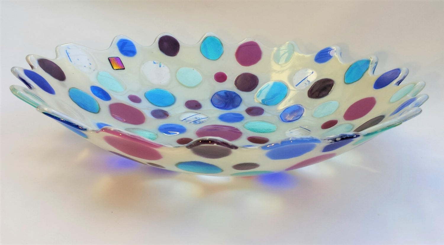 Hand cut scalloping defines the edge of this pretty statement bowl in blues and pinks. Individual circles of transparent and opaque glasses are hand cut and fired onto the scalloped shape. A layer of powdered glass is fired onto the bowl to create an opaque setting for the the lozenges of light to pop out casting their their gorgeous reflections onto the surrounding surfaces.