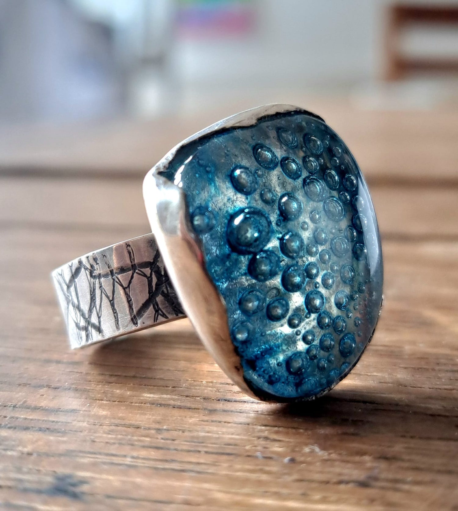 An exquisite chunky silver cocktail ring set with a large pale blue fused glass cabochon filled with bubbles that catch the light and seem like you are wearing a drop of surf on your finger.