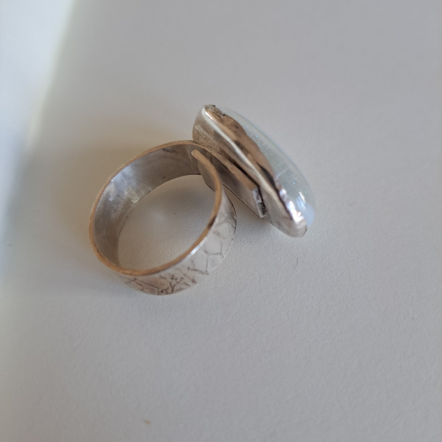 An exquisite chunky silver cocktail ring set with a large sparkly white dichroic fused glass cabochon.